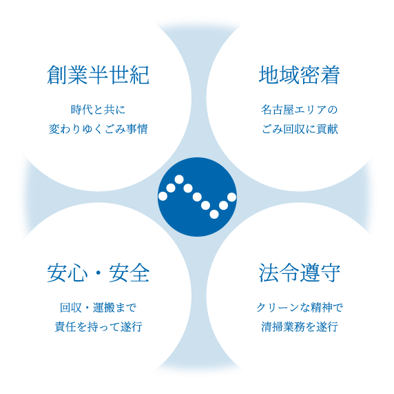 創業以来、名古屋市を中心に企業や病院や学校、福祉施設など、4,000社を超えるお客様の一般廃棄物・産業廃棄物の回収や運搬を通しごみ事業に携わってきました。ごみ減量化と資源リサイクルを推進し、貢献すべく、業界老舗のキャリアを生かして地域に貢献しております。お預かりしたごみを安全性に配慮し、スムーズで効率的なごみの回収を行っています。