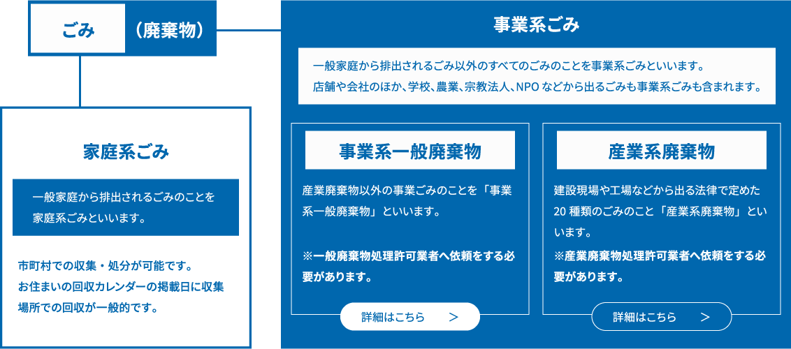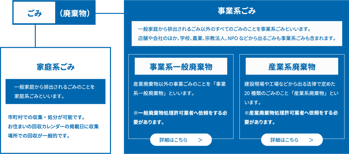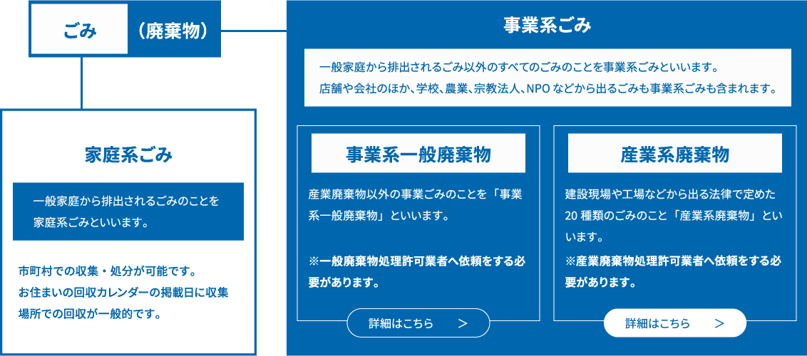 ごみには、家庭から生じる生活ごみ(家庭系ごみ)と事業活動に伴って生じるごみ(事業系ごみ)があり、事業系ごみには、産業廃棄物と事業系一般廃棄物があります。